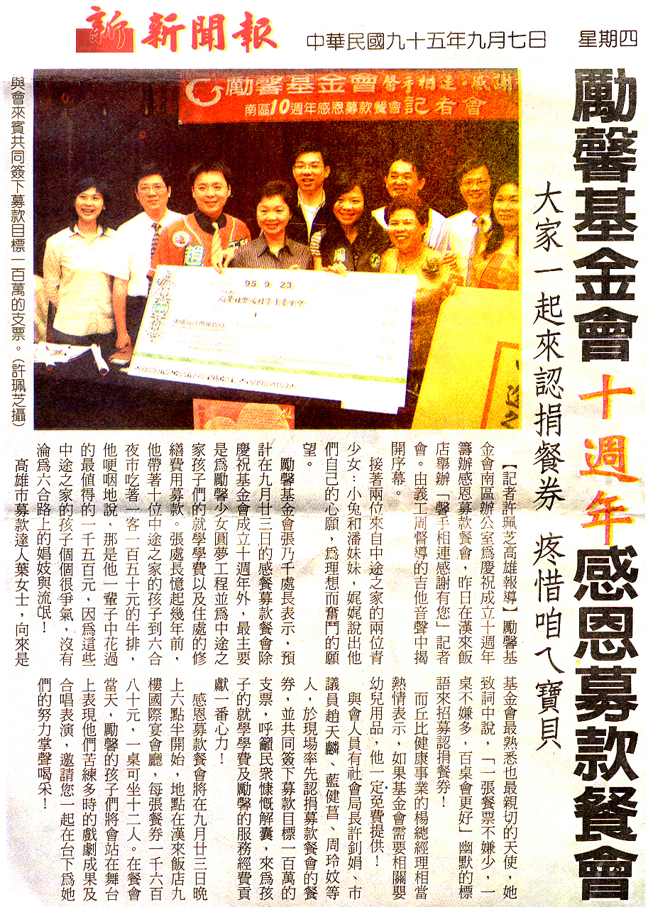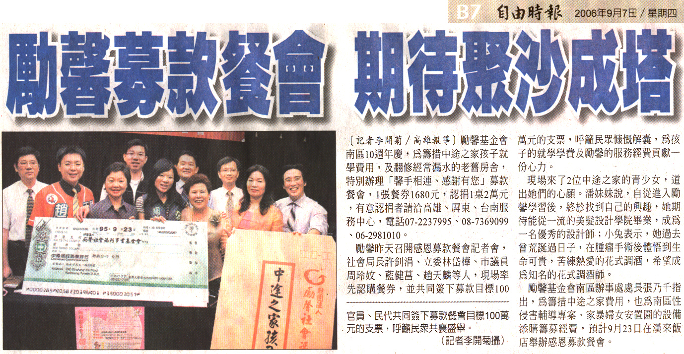 勵馨基金會張乃千處長表示,預計在九月廿三日的感餐募款餐會除慶祝基金會成立十週年外,最主要是為勵馨少女圓夢工程並為中途之家孩子們的就學學貸以及住處的修繕費用募款。