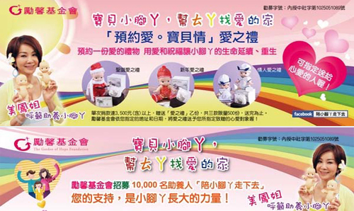 勵馨「寶貝小腳ㄚ,幫ㄊㄚ找愛的家」,是為了幫助每個小生命有機會長大,所推動的募款方案,不管是收養、助養、小額捐款,都是給ㄊㄚ最溫暖的擁抱。小腳ㄚ在找到適合收養家庭前,平均有六個月到一年的媒合等待期,期間生活開銷如:奶粉、尿布、奶瓶、衣物等以及保母費、醫療費等龐大支出。